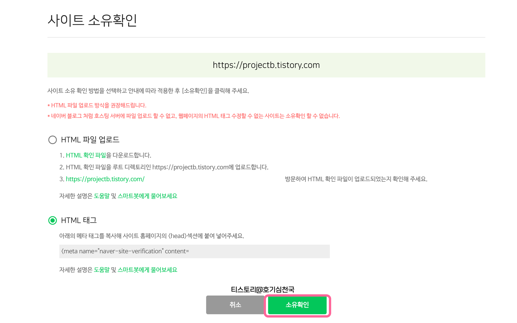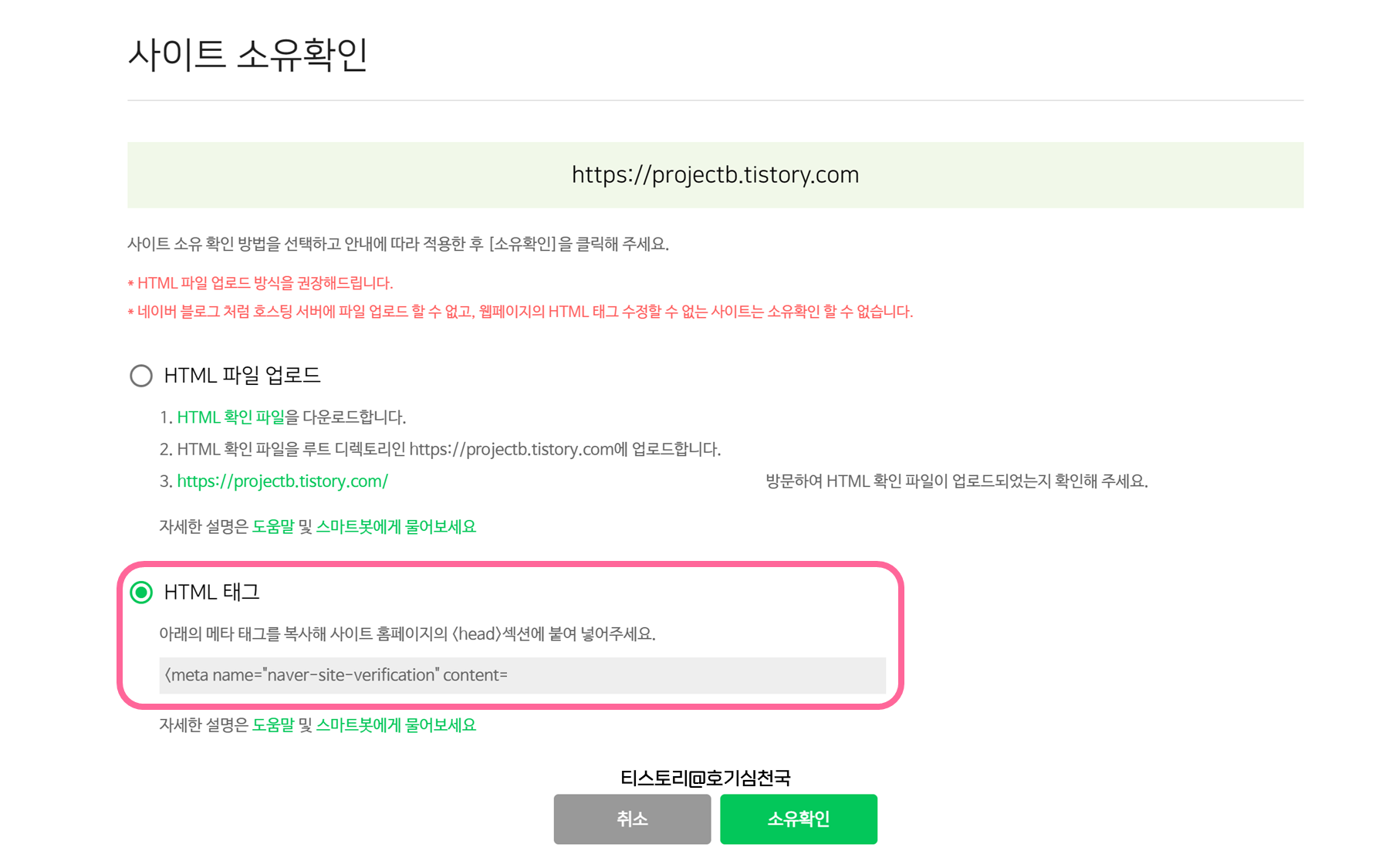 3. 갑자기 HTML 어쩌구 메타태그가 어쩌고 당황할 수 있지만 침착하게 시키는대로 메타 태그를 복사해줍니다.