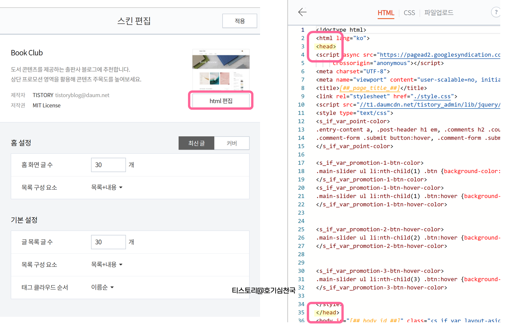 4. 티스토리 하면서 안 볼수가 없는... HTML 편집을 눌러서 <head> </head> 태그를 찾아 사이에 메타태그를 복사해줍니다. 저는 구글 애드센스 등록하면서 붙여넣었던 태그 바로 아랫줄에 추가로 넣어주었습니다 ^^