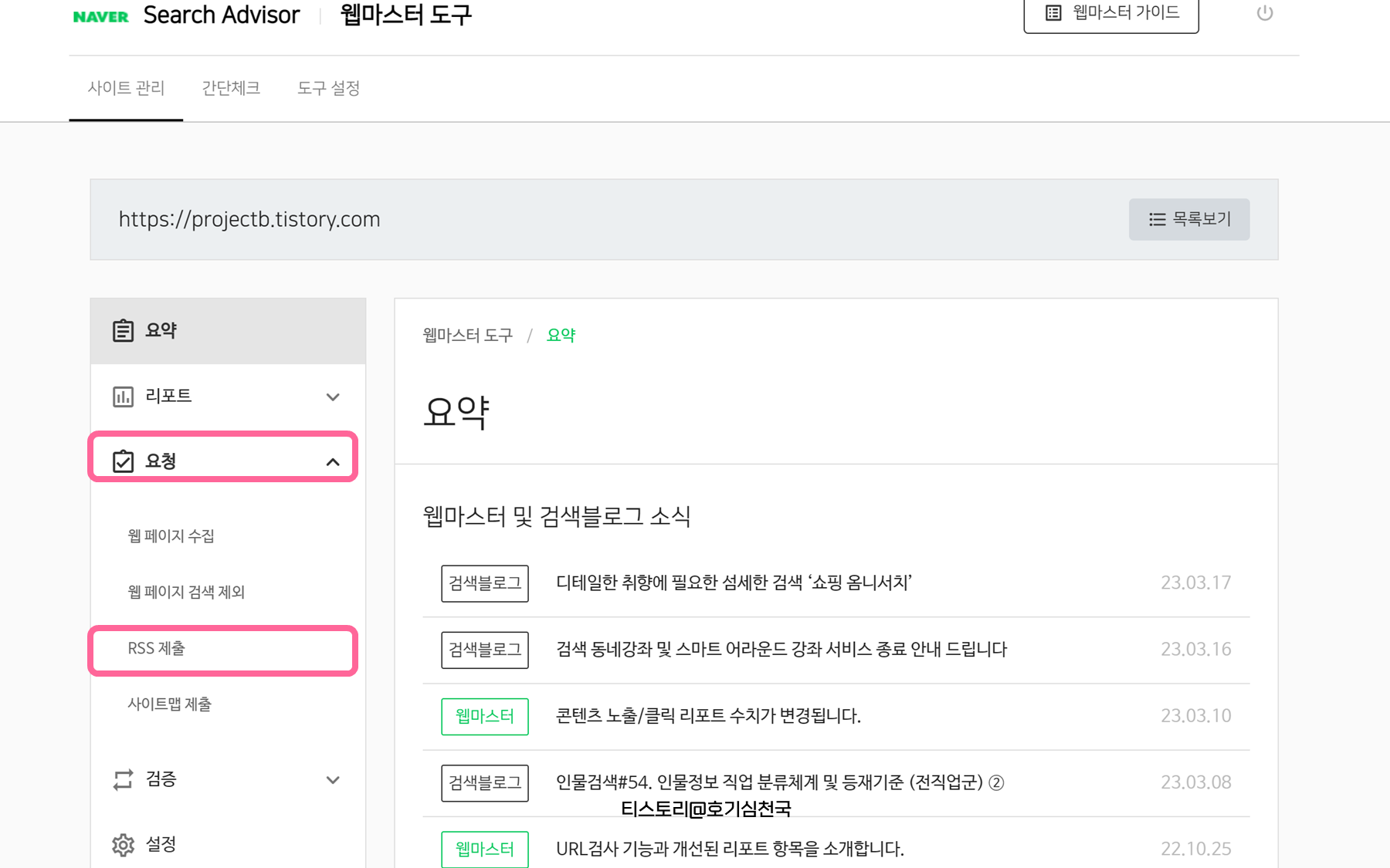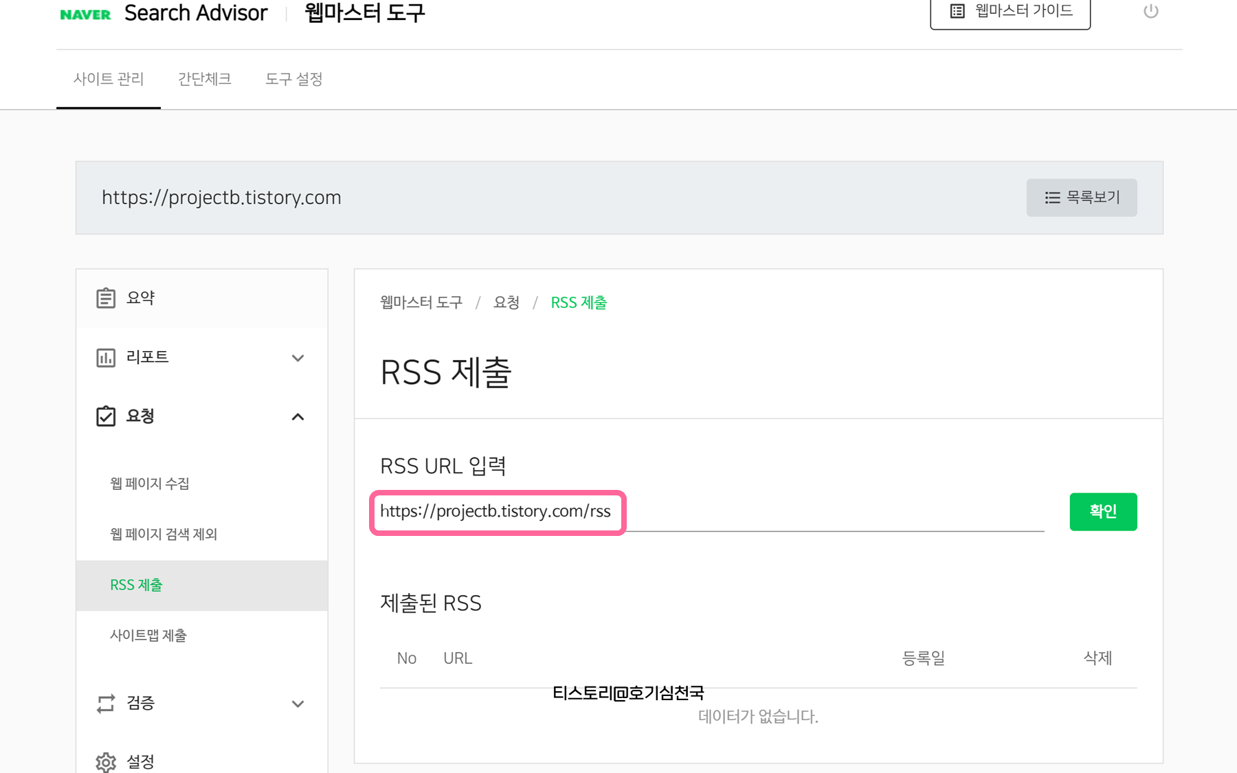 7. 사이트 관리 - 요청 - RSS 제출 순으로 누른 뒤, 네이버 검색에 등록할 블로그 주소에 /rss를 추가하여 입력해줍니다.