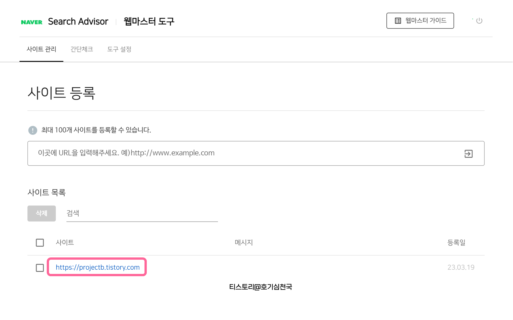 2. 사이트관리 - 사이트 등록에서 네이버 검색에 등록할 티스토리 블로그 주소를 입력해줍니다.