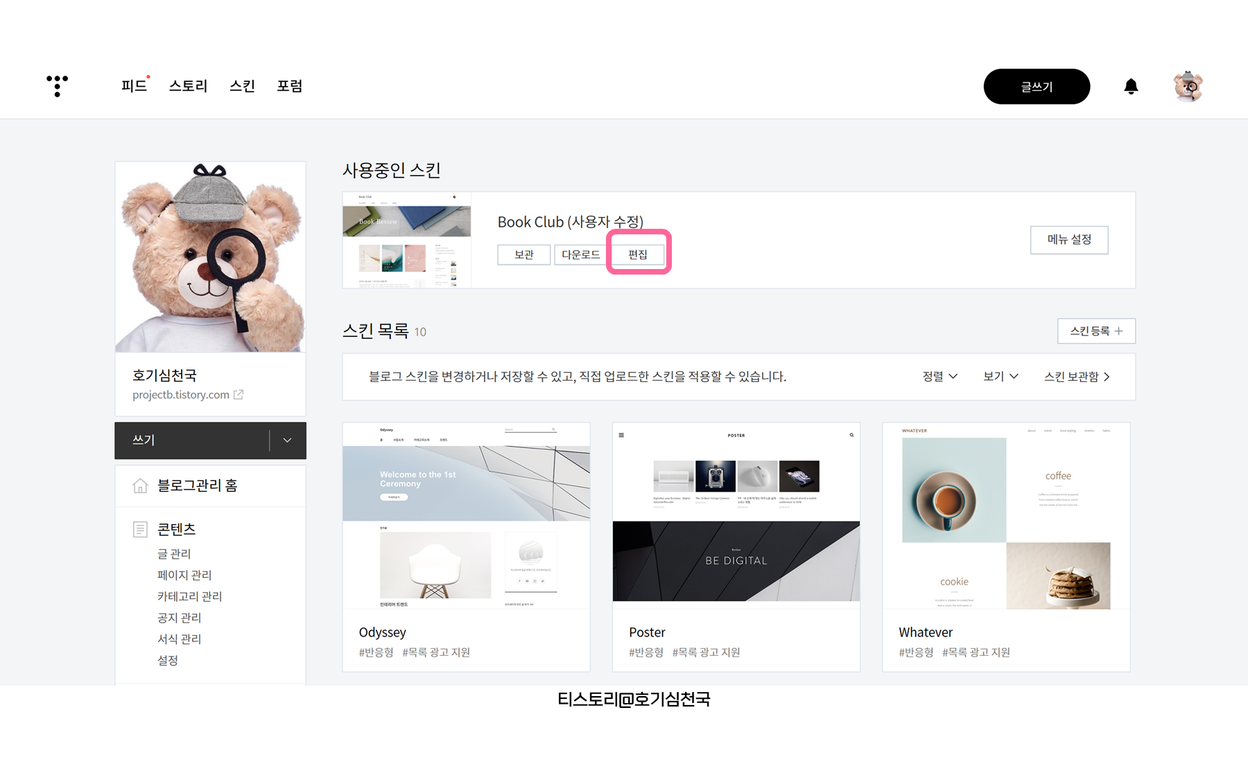 3. 티스토리 설정 메뉴로 들어와 스킨 관리 - 편집을 눌러줍니다.