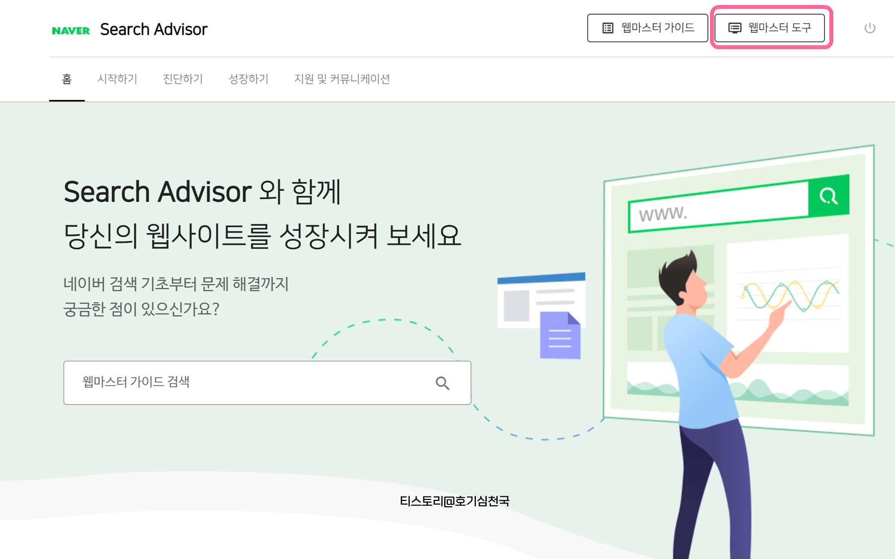 1. 네이버 검색에 티스토리 블로그가 검색이 되도록 하기 위해서는 먼저 네이버 서치어드바이저의 웹마스터 도구에 접속해줍니다.