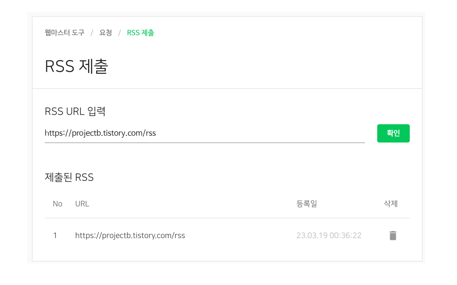 7. 사이트 관리 - 요청 - RSS 제출 순으로 누른 뒤, 네이버 검색에 등록할 블로그 주소에 /rss를 추가하여 입력해줍니다.
