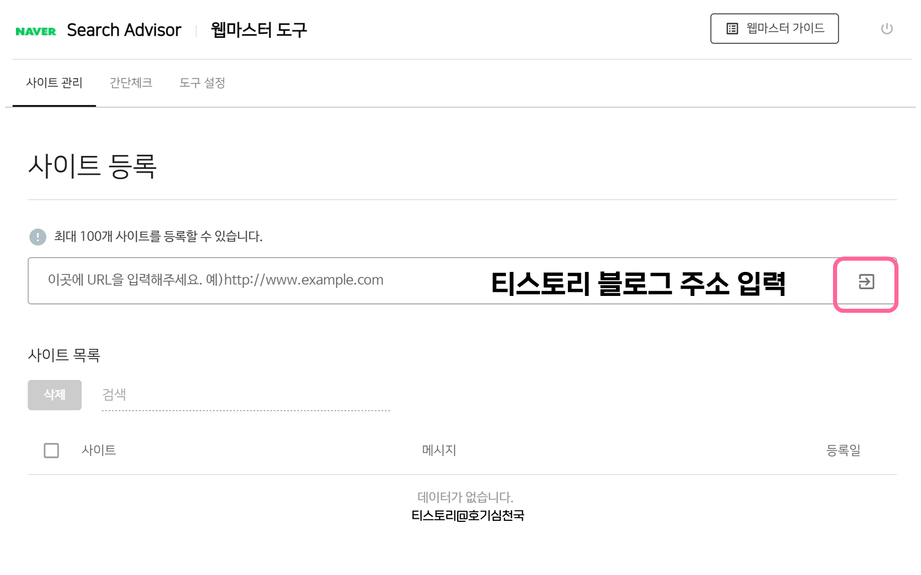 2. 사이트관리 - 사이트 등록에서 네이버 검색에 등록할 티스토리 블로그 주소를 입력해줍니다.