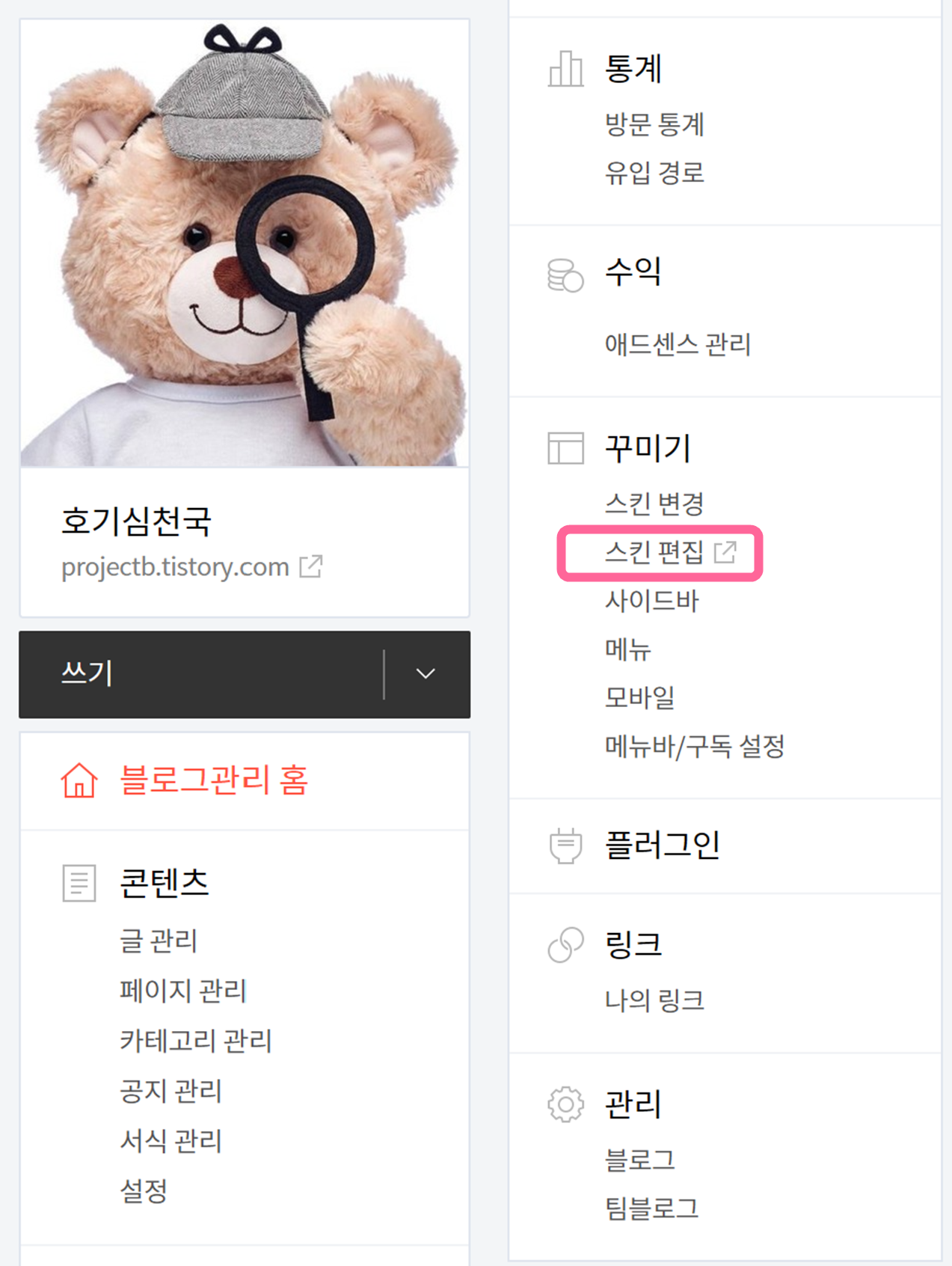 1. [티스토리 블로그 관리 홈] - [꾸미기] - [스킨 편집]에 들어가줍니다.