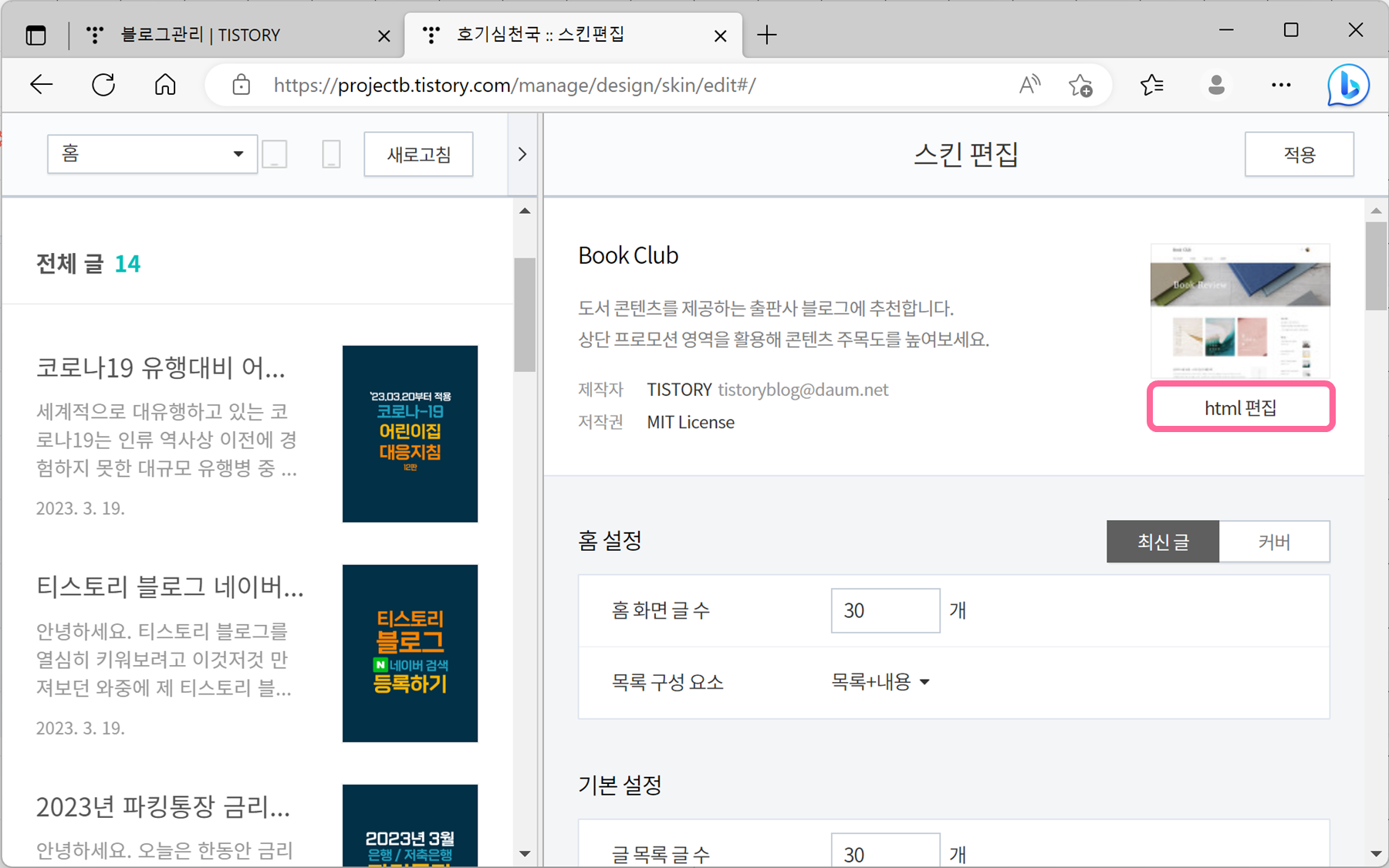 2. [스킨편집] - [html 편집]에 들어가줍니다.