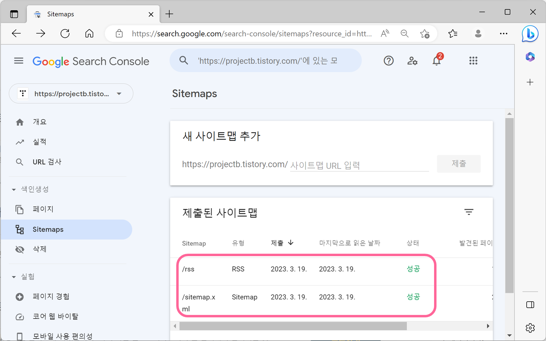9. 이어서 구글 서치콘솔 - 사이트맵을 눌러 rss를 추가해줍니다. (등록이 안되거나 확인되지 않는 사이트라고 뜰 경우, 사이트맵을 삭제했다가 다시 등록해주시면 잘 뜹니다.)