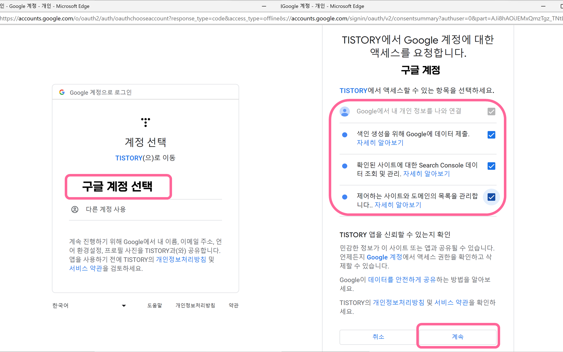 4. 티스토리와 연결한 구글 계정으로 로그인해줍니다. 모든 항목을 체크하고 [계속] 버튼을 누릅니다.