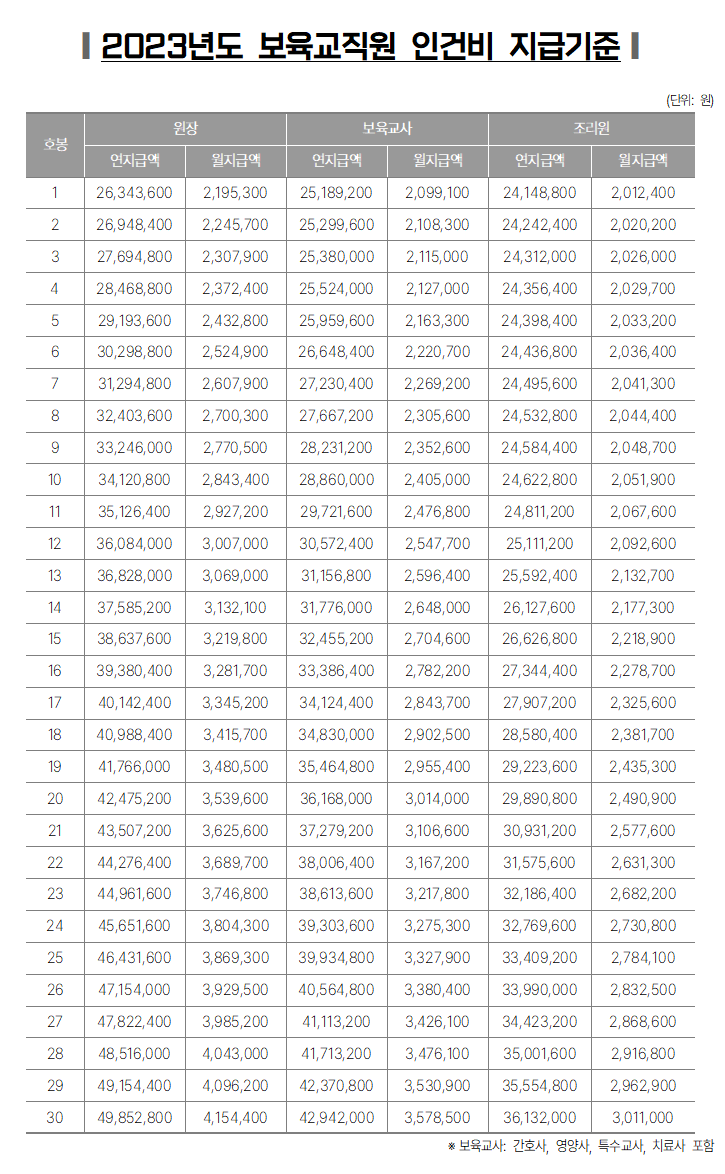 2023년도 보육교사 호봉표 (보육교직원 인건비 지급기준)