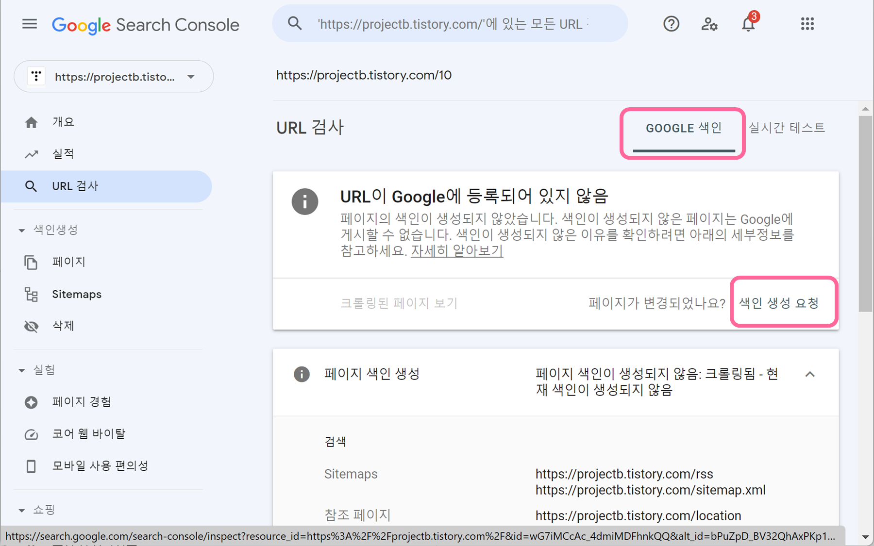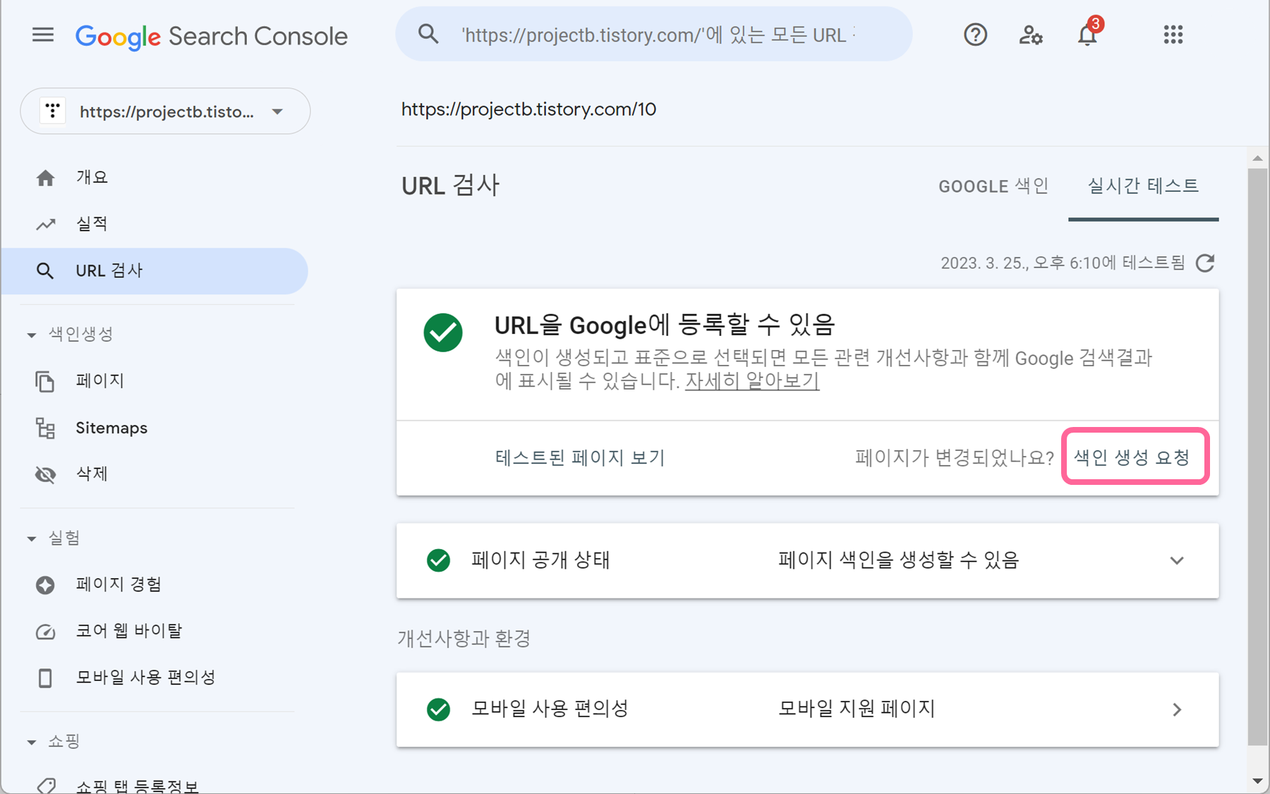 4. 테스트가 끝나면 페이지가 변경되었나요? 옆에 있는 색인 생성 요청을 눌러줍니다.