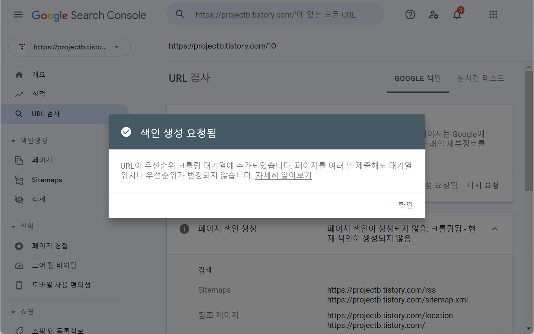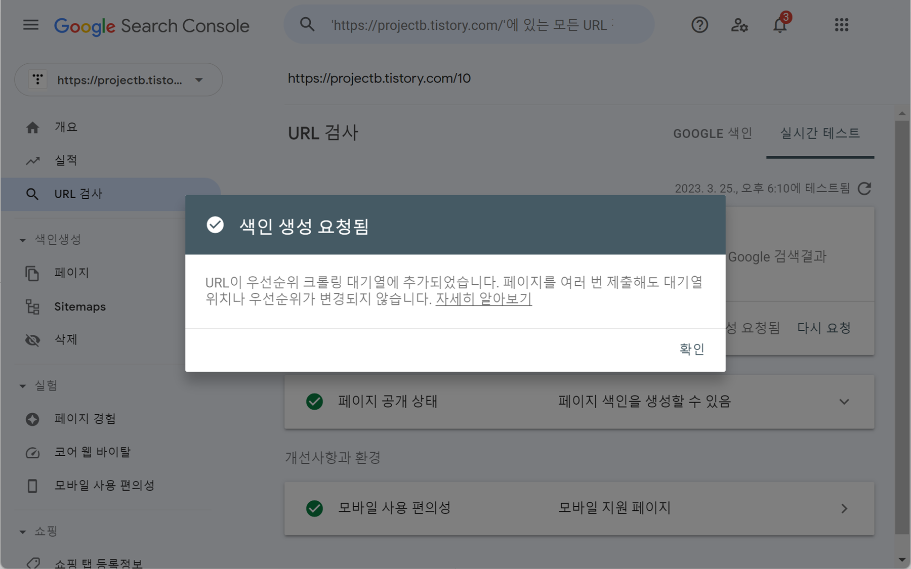 5. 색인 생성 요청됨 화면이 뜹니다. 확인을 눌러줍니다.