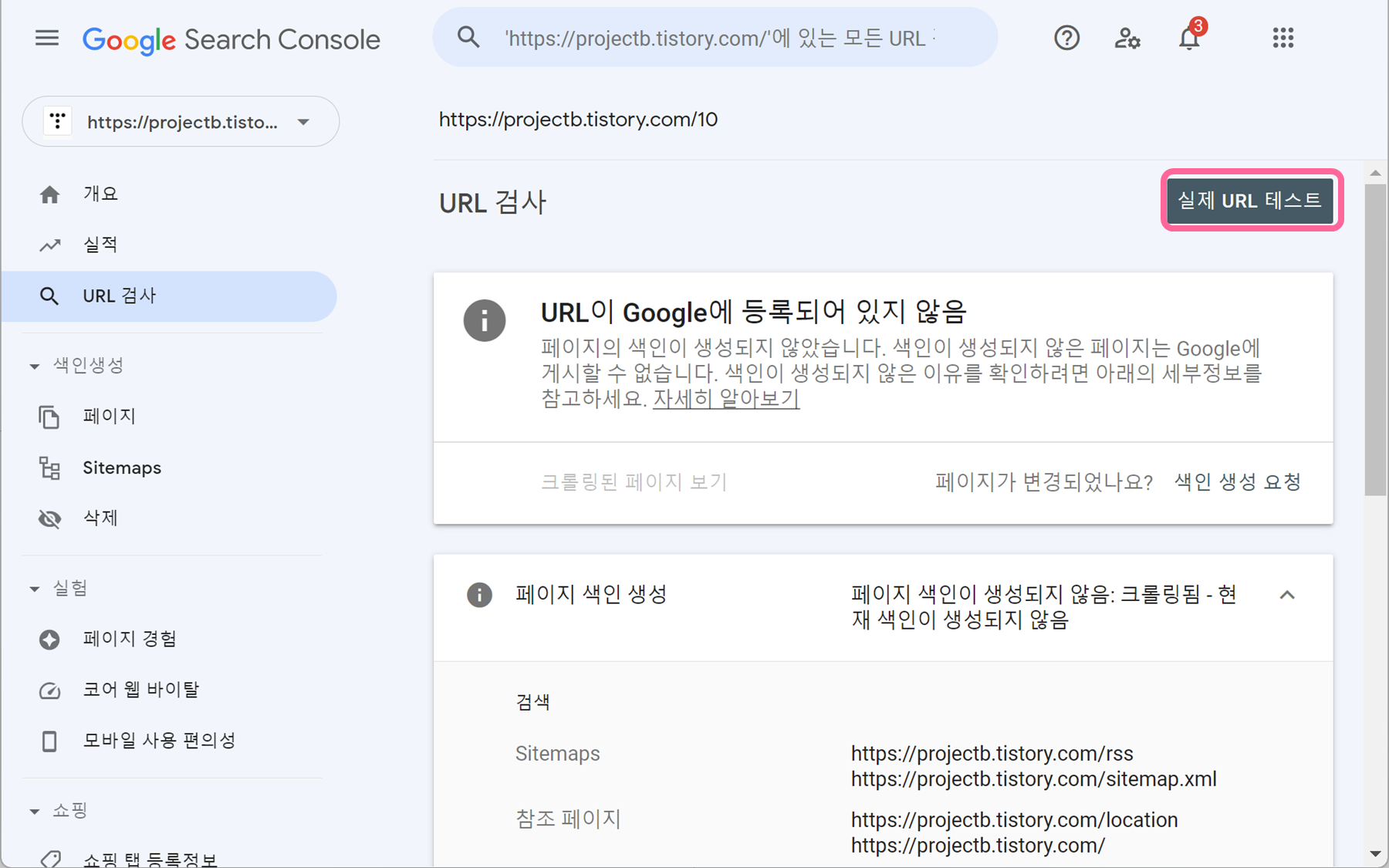 2. URL이 Google에 등록되어 있지 않음 이라는 글씨와 함께 새로운 화면이 뜨는데요. 우측 실제 URL 테스트를 눌러줍니다.
