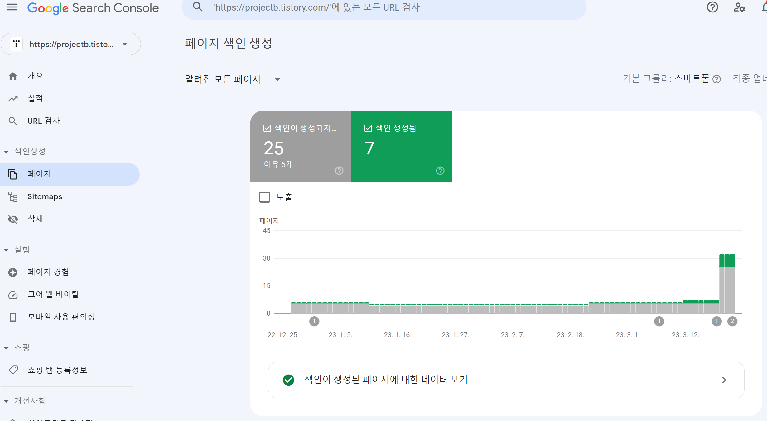 구글 서치콘솔 메인화면 - 색인생성 - 페이지 화면에 접속하자 색인이 생성되지 않은 페이지가 무려 25페이지...나 되는 것을 확인할 수 있었어요.
