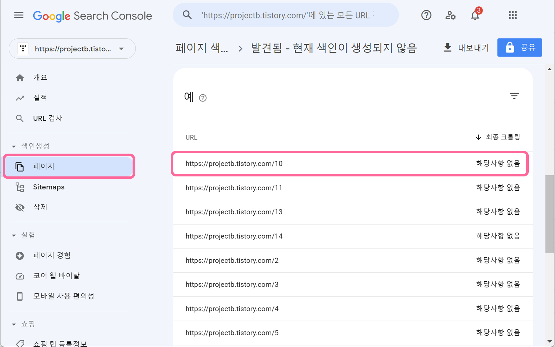 1. 구글 서치콘솔 - 색인생성 - 페이지 화면에 들어가서 색인이 생성되지 않은 페이지 URL을 클릭합니다.
