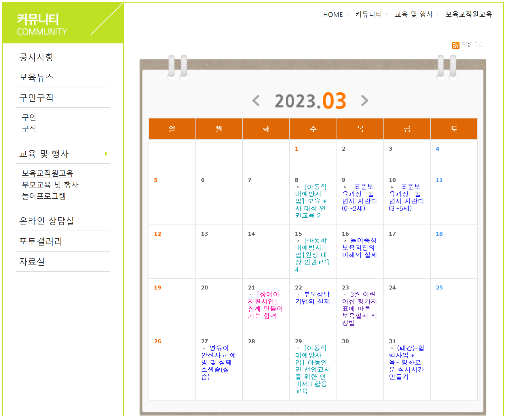 각 관내 육아종합지원센터 홈페이지에 따라서 교육 신청 방법은 다를 수 있겠으나 보통 '교육 및 행사' 라는 탭에서 신청이 가능한 것으로 확인됩니다.