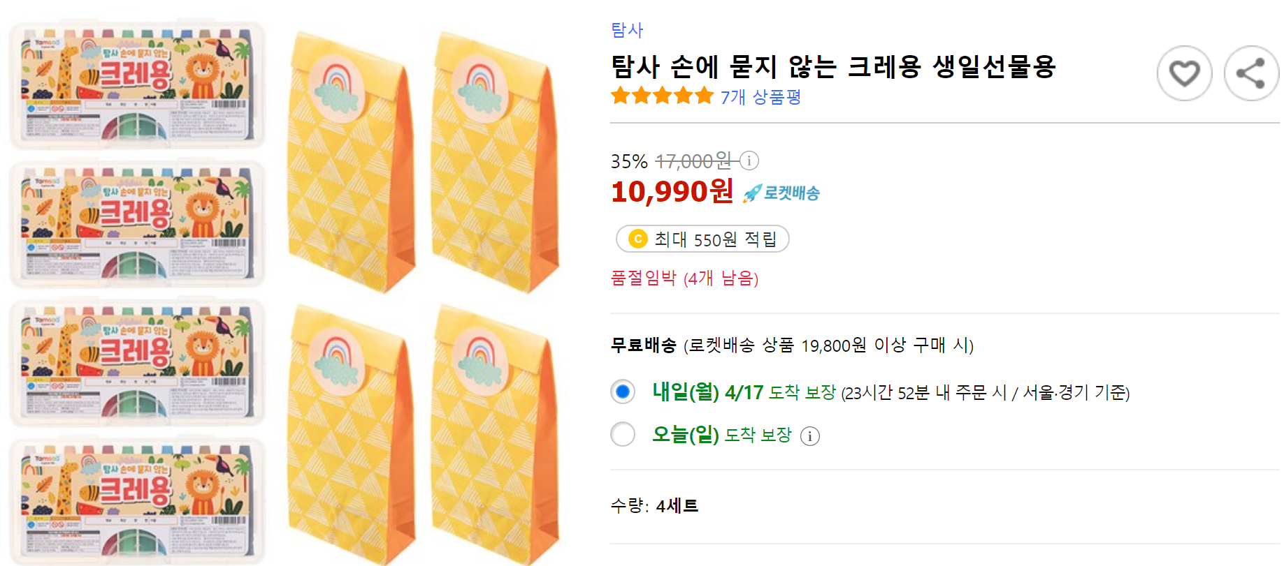 6. 쿠팡 / 크레용(봉투,스티커 포함) / 19,800원 이상 구매 시 무배 / 17,000원 (개당 4,250원)