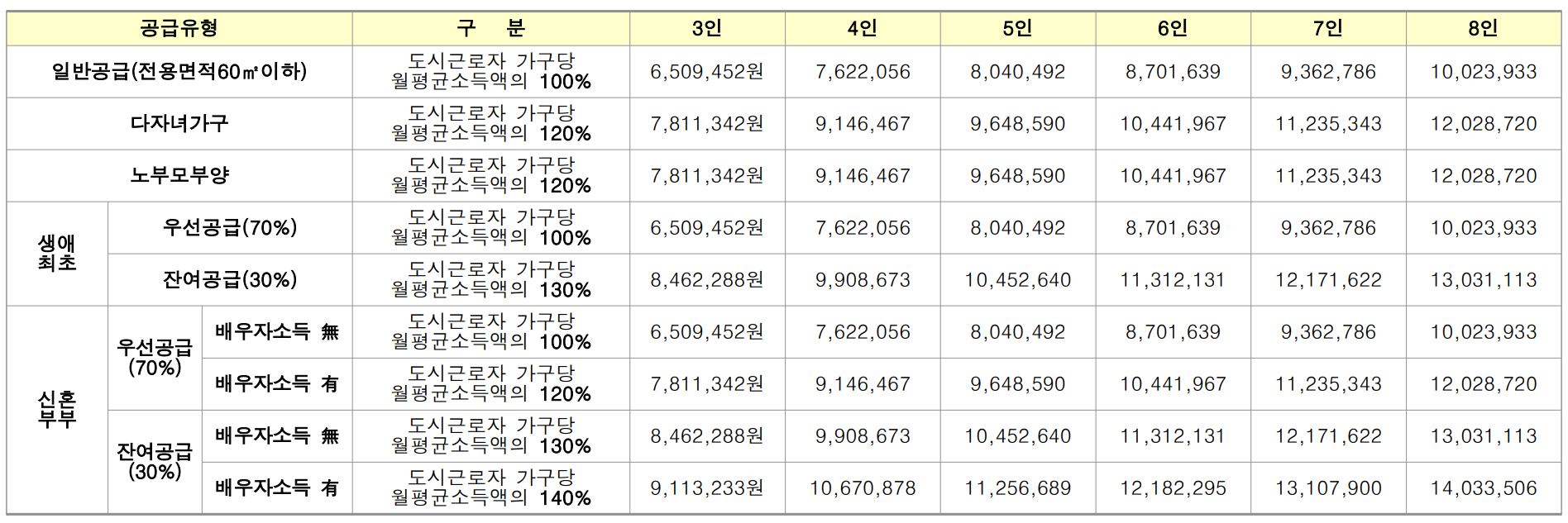 일반공급의 경우 월평균소득 100% 이하 조건을 맞추어야 합니다. (다자녀120% / 신혼부부, 생초 130% / 노부모 120%)