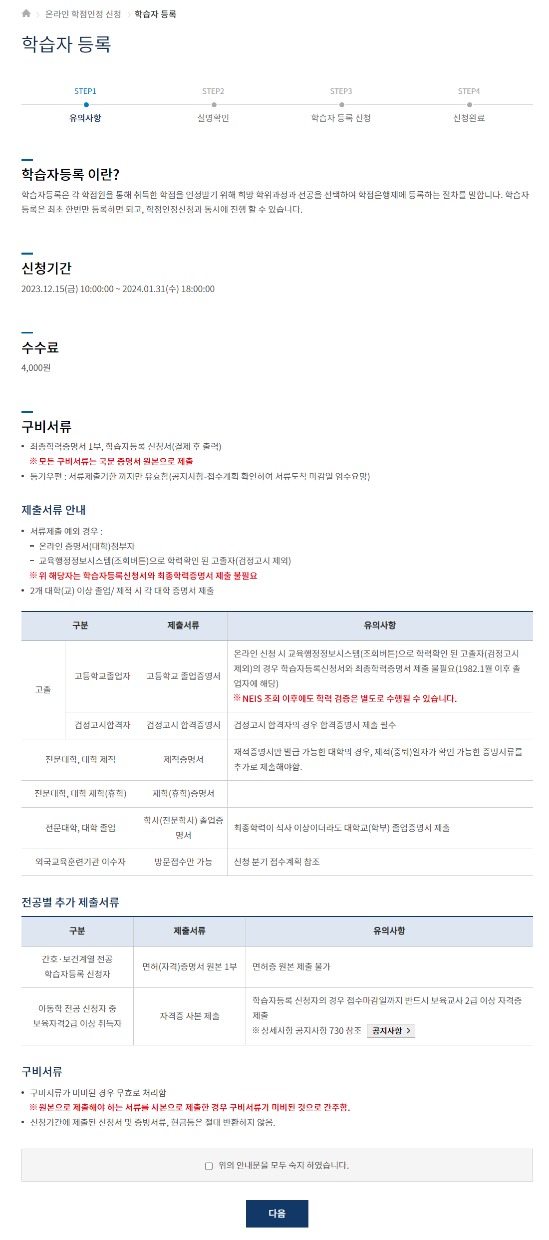 등기를 보내야 하는 모든 서류(최종학력증명서 등)는 원본을 첨부해서 송부해야 하며 학점인정제 학습자 등록 수수료는 4천원입니다.