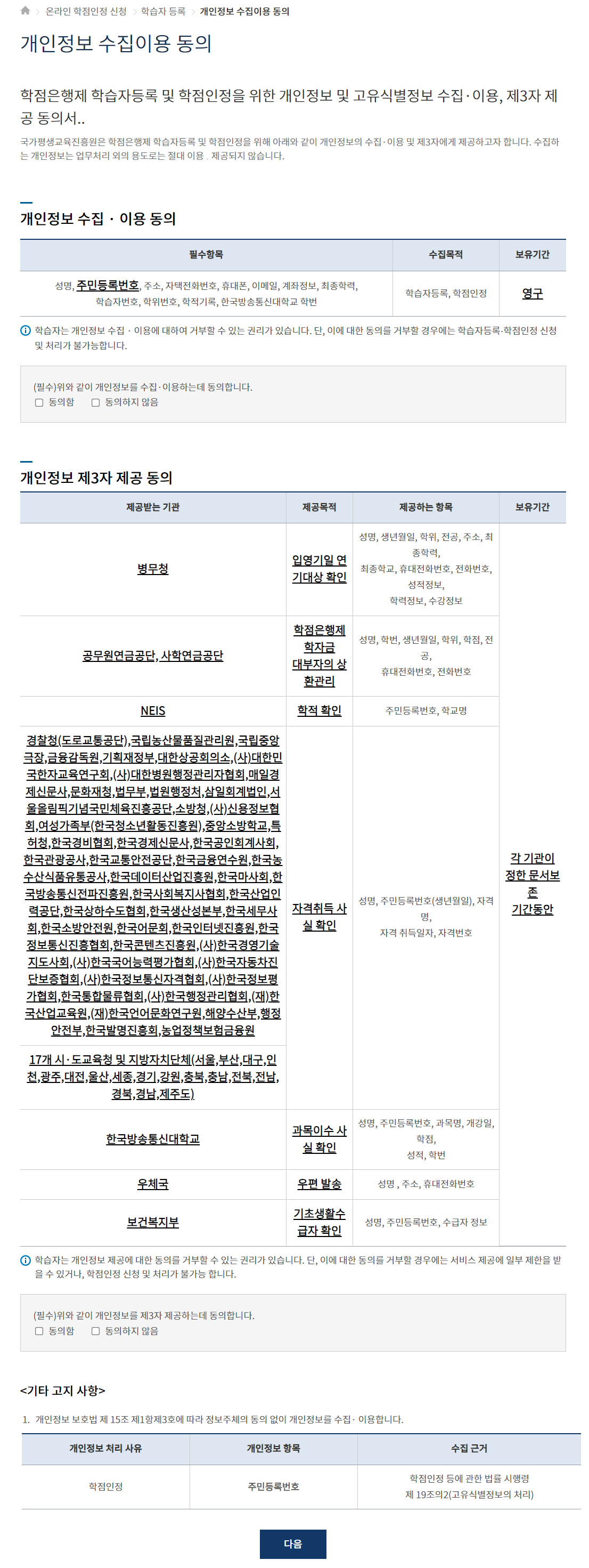 4. 다음 눌러주고 계속 진행해봅니다. 개인정보 수집 이용 동의 체크해줍니다.