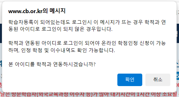 2. 처음 로그인 하니 '학습자 등록이 되어있는데도 로그인 시 이 메세지가 뜨는 경우 ~ 어쩌구 하면서 팝업창이 하나 떴는데요. 무슨 말인지 긴가민가해서 일단 확인를 눌러주었습니다. 학습자 조회 창이 떠서 입력하니 해당 사용자를 찾을 수 없다고 뜨네요. 당연하죠. 왜냐면 아직 학습자 등록을 안했으니까... 이어서 학습자 등록을 해주도록 하겠습니다.