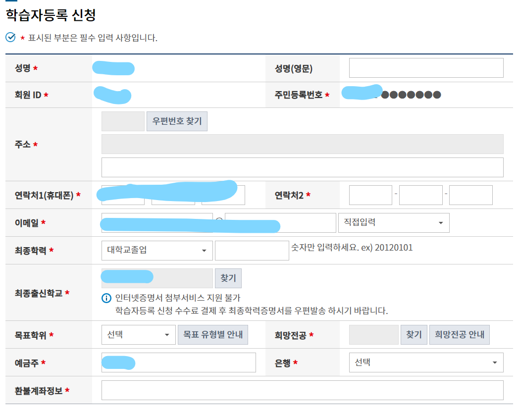 6.학습자 등록 신청서를 작성해줍니다.