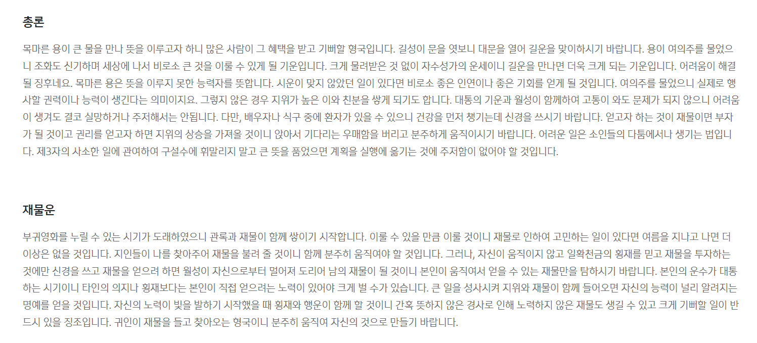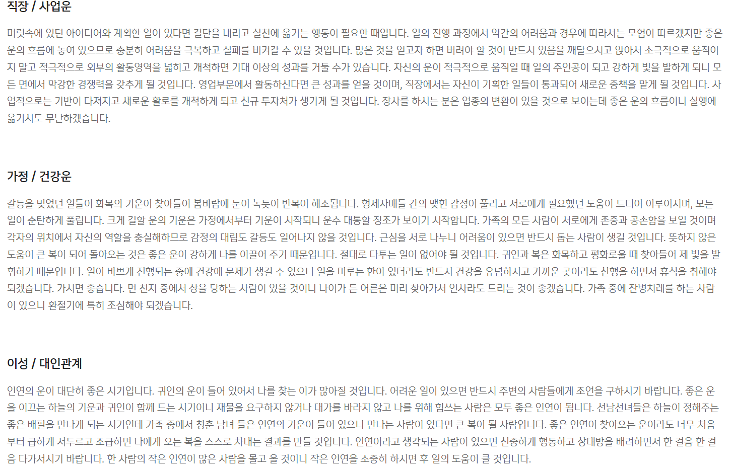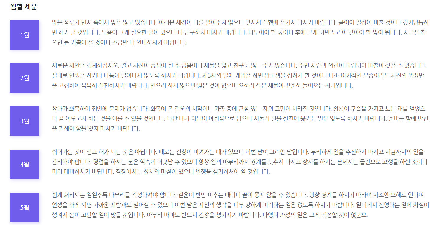 5. 총론, 재물운, 직장/사업운, 가정/건강운, 이성/대인관계, 월별세운까지 자세하게 볼 수 있답니다.