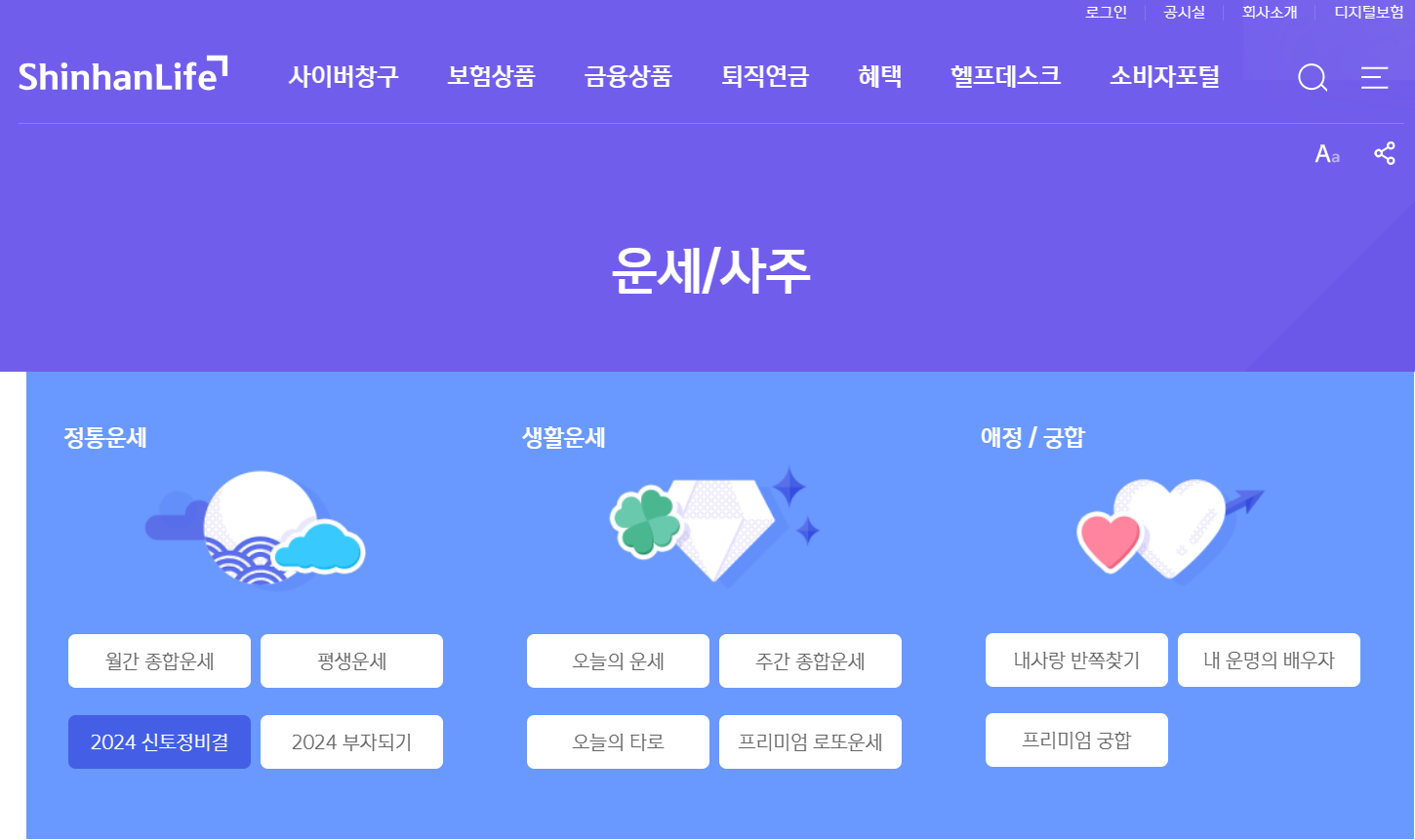 1. 위 이미지를 누르면 신한라이프로 이동합니다. 정통운세 쪽을 보면 2024 신토정비결 버튼이 보입니다.