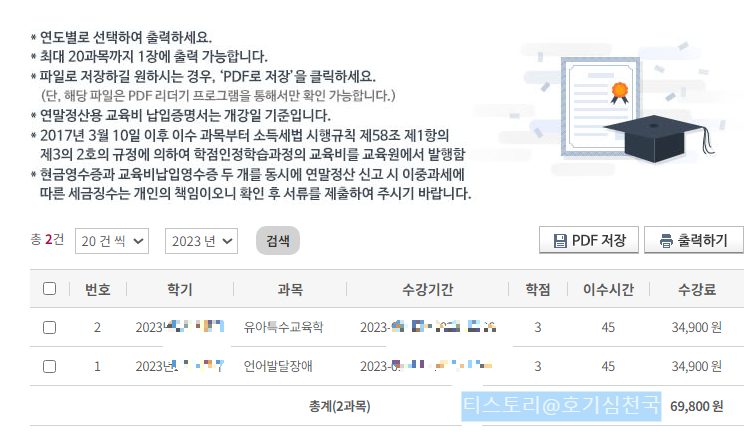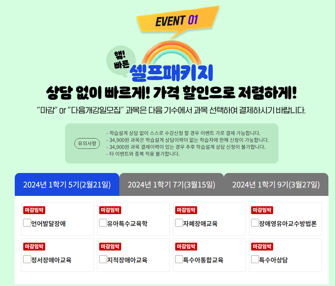 저같은 경우는, 인정되지 않은 과목까지 인정과목으로 착각해서 첫번째 장애영유아보육교사 자격 신청은 불인정 판정을 받았습니다. 다시 확인해보니 스스로 아리까리^^; 하다고 여겼던 2과목이 모두 인정과목으로 처리되지 않았던 듯 했습니다. 원격평생교육원은 광고가 많아도 너무 많아서 대강 찾아보다가 제가 찾아 본 중에서는 제일 저렴했던 해커스원격평생교육원에서 셀프패키지로 2과목을 수강하였습니다. (1과목당 34,900원)