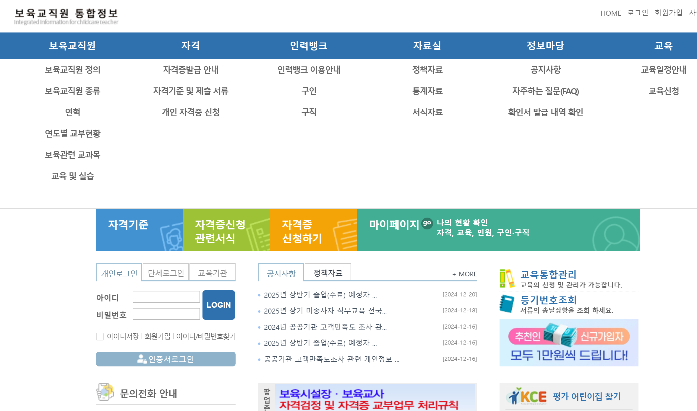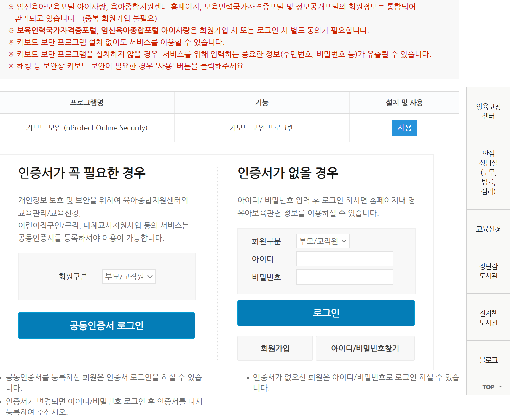 육아종합지원센터 홈페이지에서는 <잘못된 접근입니다> 타령을 하면서 계속 막혔던 것이 보육교직원 통합정보 사이트에서는 한큐에 해결됩니다.